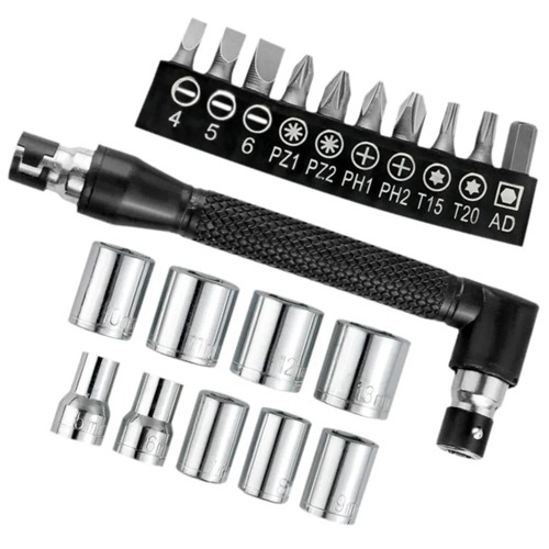 Універсальний набір інструментів, який включає кутовий торцевий L-подібний ключ 1/4, 10 біт і 9 торцевих головок. Сфера застосування інструменту досить широка, а завдяки своїй кутовій формі ключ можна використовувати у важкодоступних місцях. Набір аксесуарів, що постачаються в комплекті, покриє широкий спектр завдань, а якісні матеріали виготовлення забезпечать довговічне використання набору.