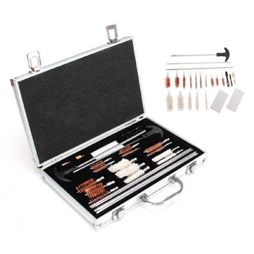 Універсальний набір для чищення пістолетів, гладкоствольної зброї та карабінів в алюмінієвій валізі (кейсі) для зручного зберігання та транспортування. Включає все необхідне для якісного і швидкого чищення рушниці, а саме: