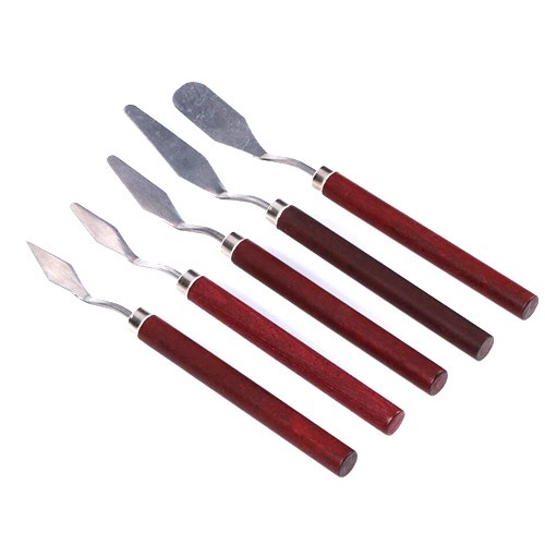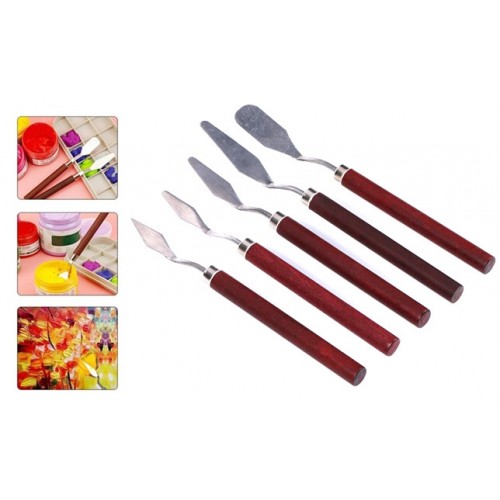Набір із 5 мастихінів (художніх шпателів) з тонкою простираною сталевою декою. Використовуються для змішування гуаші та масляних фарб, для нанесення фарб на палітру та полотно, а також для очищення полотна від зайвої фарби та помилково нанесених мазків. Набір дозволить освоїти техніку роботи мастихіном, а також створити нові мистецькі шедеври.