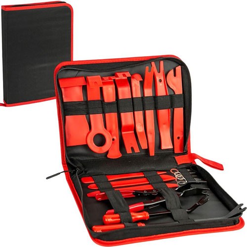 Розширений набір інструментів для обережного демонтажу елементів салону автомобіля. Підходить для зняття пістонів, кліпсів, обшивки, декоративних панелей, молдингів та автомагнітол без пошкодження поверхонь.