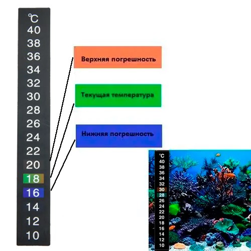 Самоклеючий термометр-наклейка приклеюється до зовнішньої стінки акваріума, завдяки чому не займає місце. Спеціальна термофарба на наклейці змінює свій колір залежно від поточної температури: що яскравіше колір цифри, то точніше до цього значення температура вимірюваної поверхні.