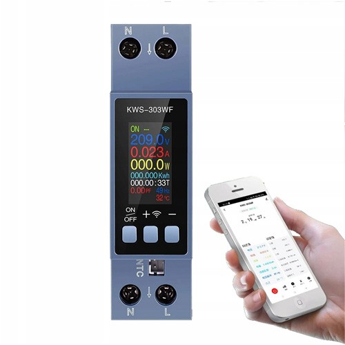 KWS‑303WF — це цифровий багатофункціональний лічильник-вольтметр, амперметр та енергомонітор із можливістю Wi‑Fi керування через програми Tuya або Smart Life (QR-код для скачування на корпусі).